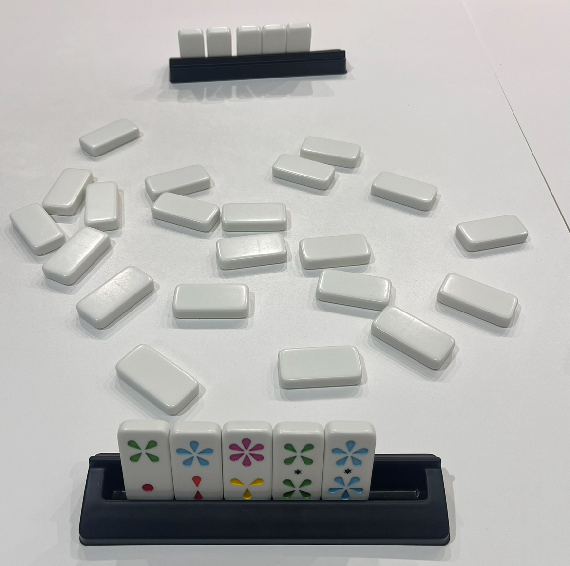 写真のように場に全ての牌を伏せて置き、1人5枚ずつランダムで牌を取り、並べます。