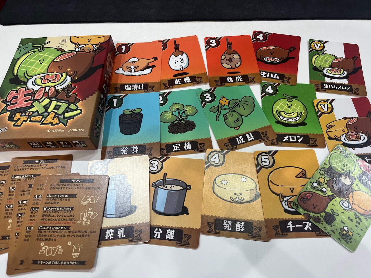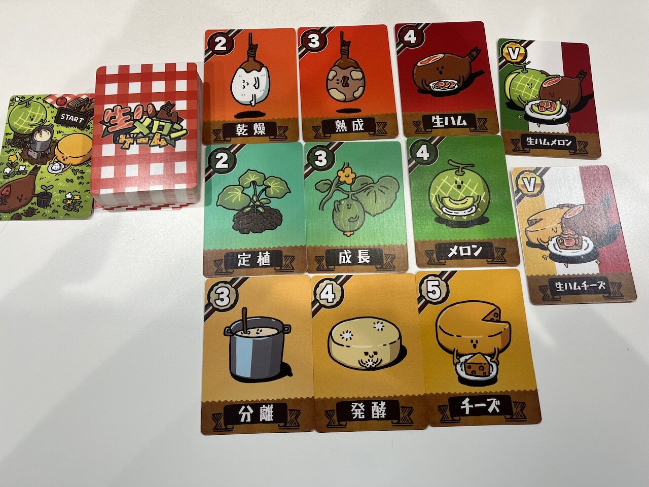 手札のカードを揃えて材料を集め、生ハムメロンを作る事を目指すゲームです。