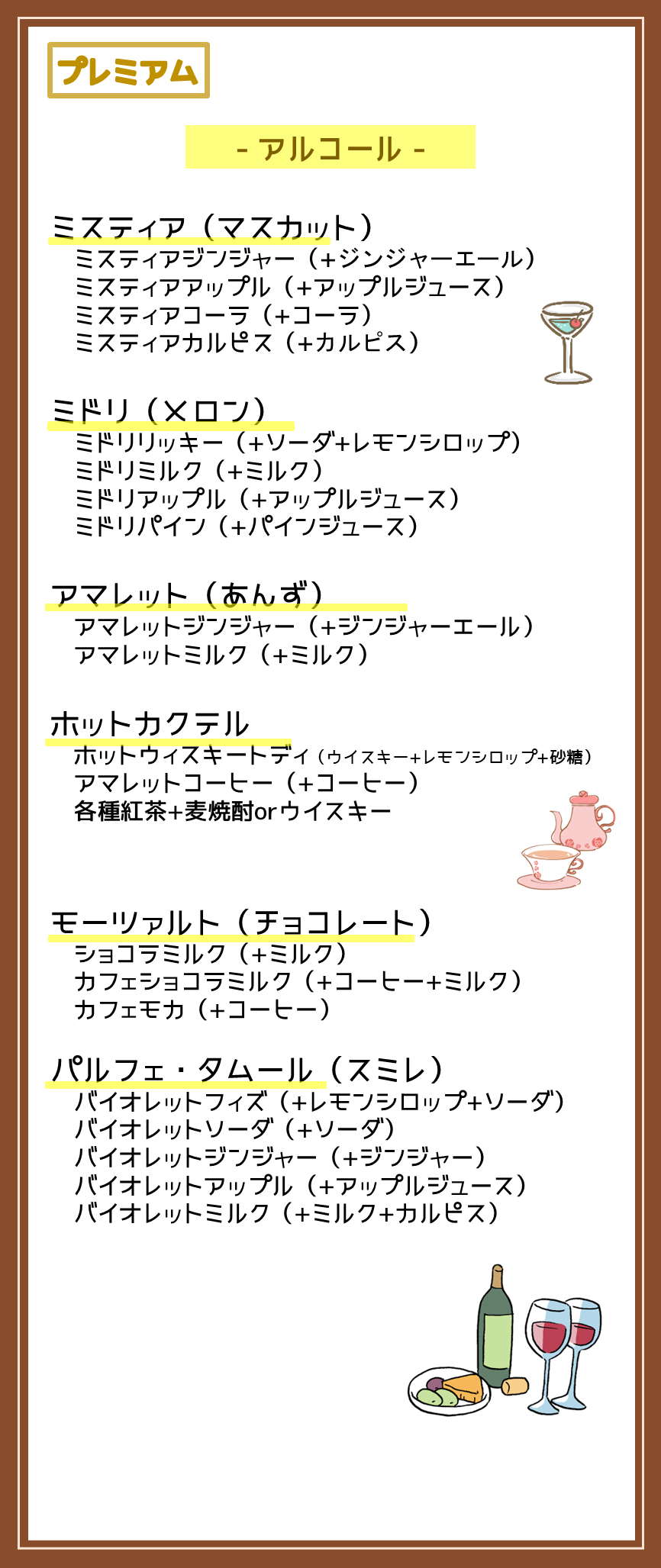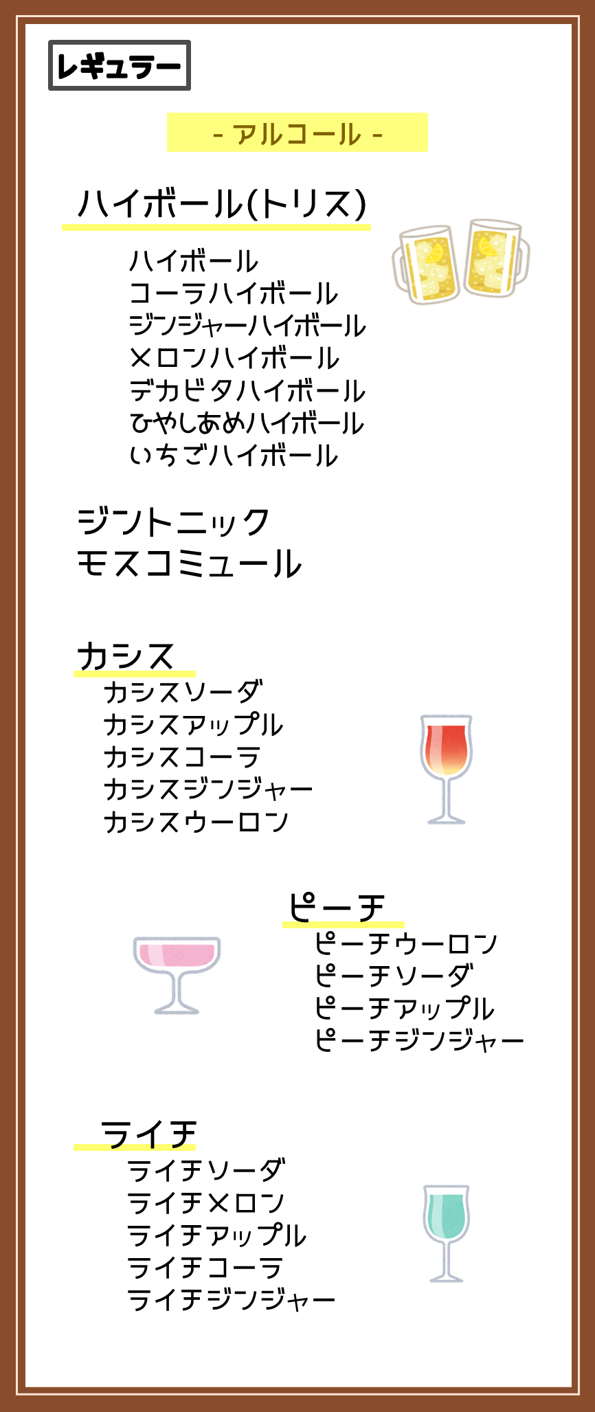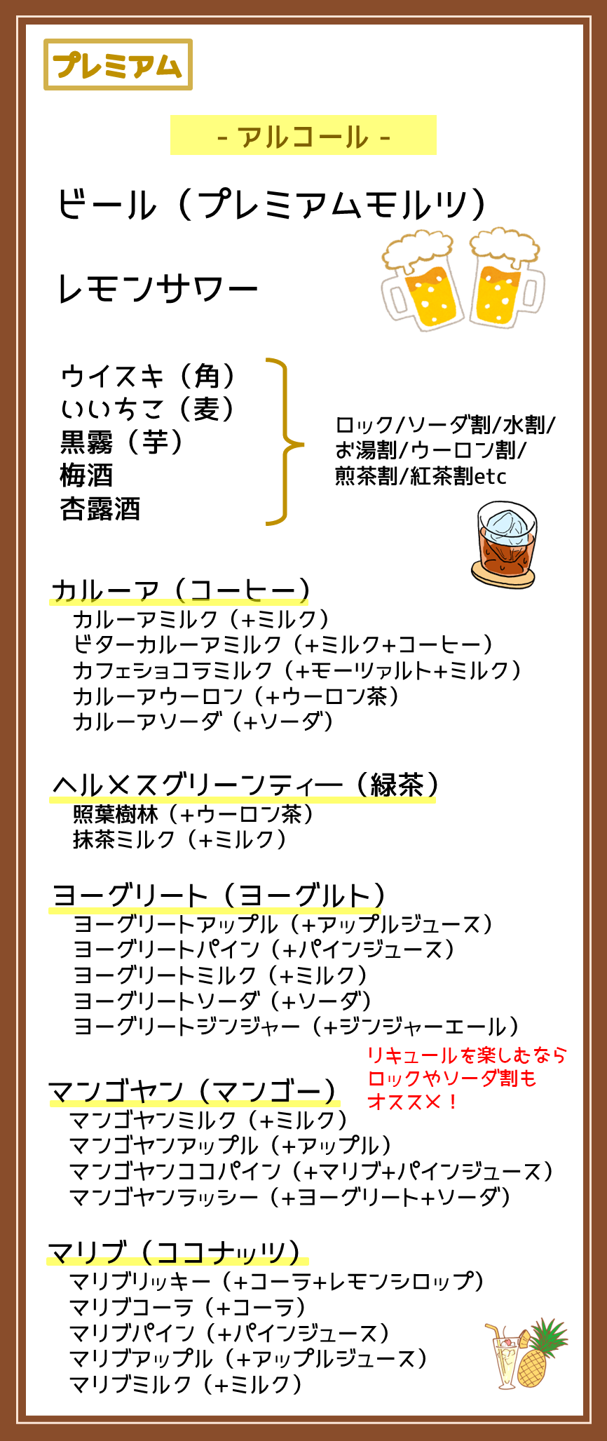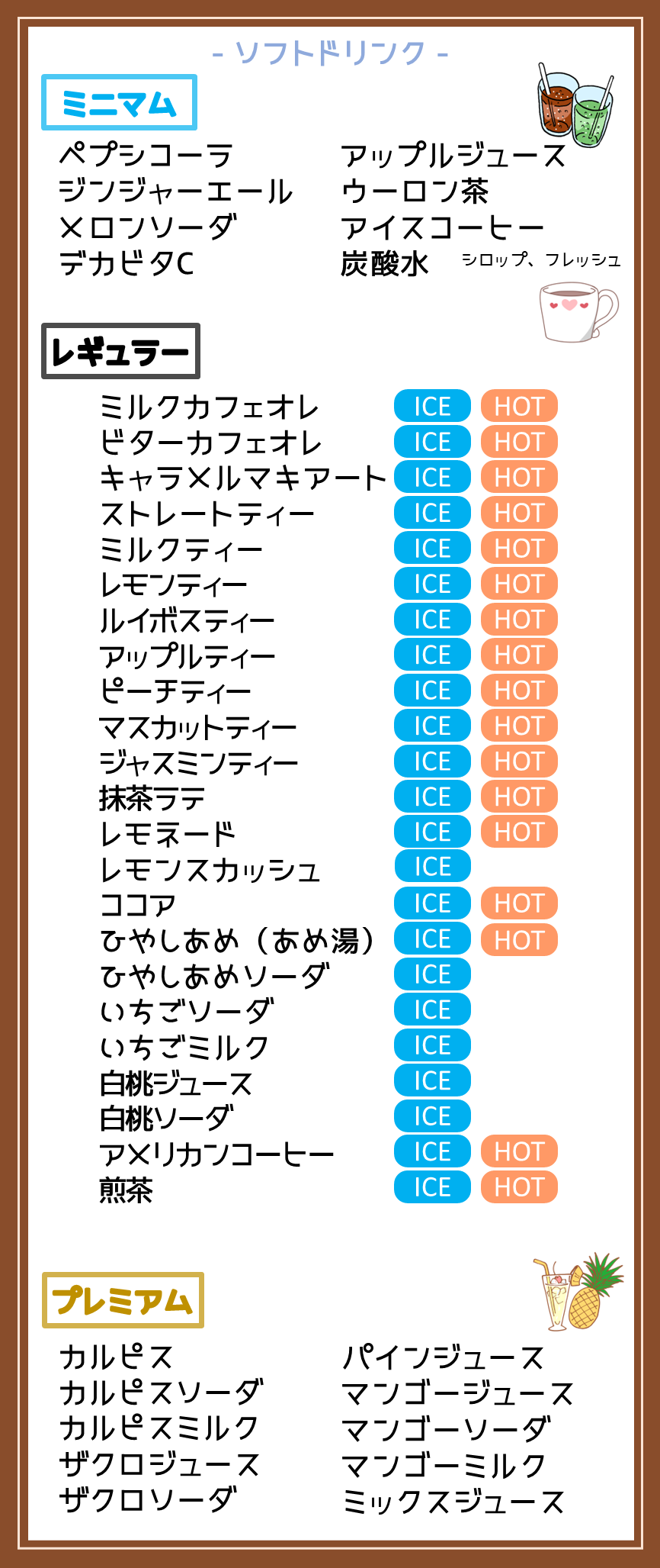 メニュー 2016年3月1日2026年4月1日 ドリンクは全て飲み放題です。プラン毎に飲み放題対象が変わります。 プラン料金について、詳しくはこちら。→料金ご予約 ゲームのリストはこちら。→ゲームリスト ドリンク・フード 持ち込みについて ドリンク・フードともに持ち込みが可能です(個包装の手が汚れないものに限る) ※アルコール類の持ち込みは、レギュラー・プレミアムプランのみとなります。