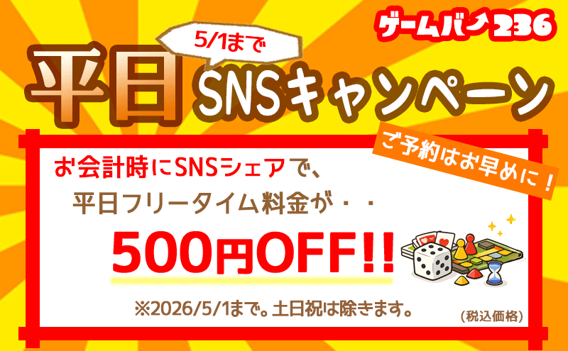 当店では、平日にゆっくりボードゲームを楽しんでいただけるよう、